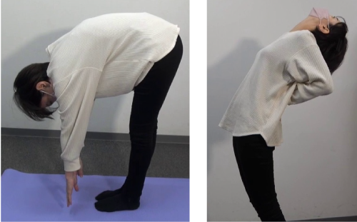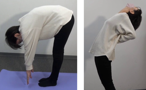 ⽴ち姿勢にて前屈や後屈を⾏い、可動性をチェックしてみましょう。