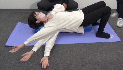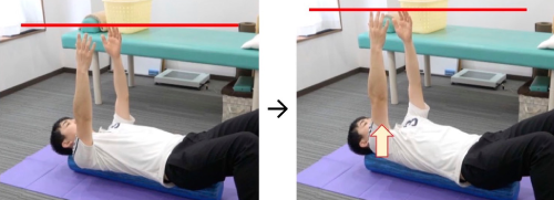 左⼿で右鎖⾻周辺を軽く抑え、右肩を挙上していきます。
